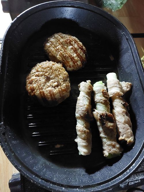 フライパンでネギとハンバーグ焼いてみる。